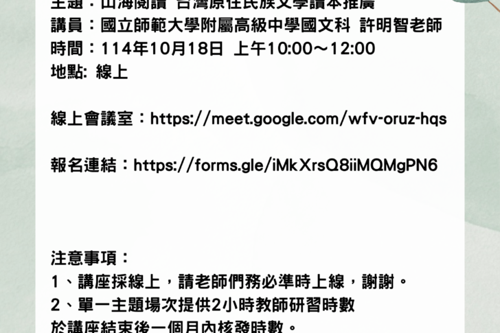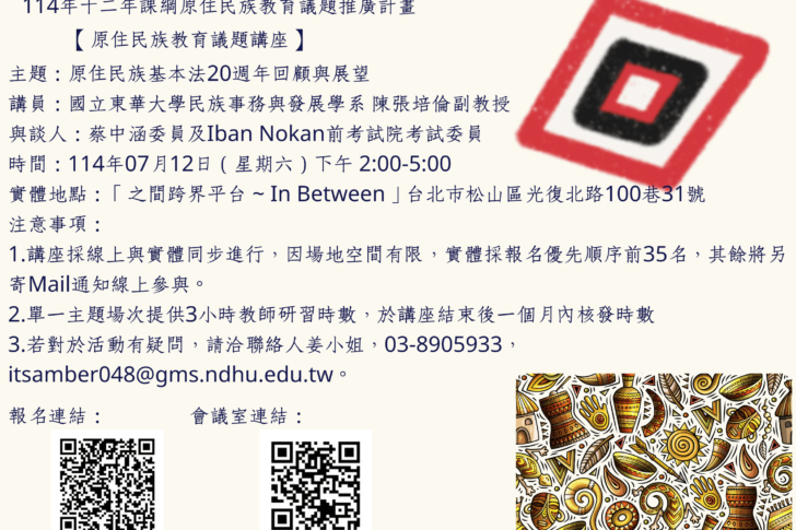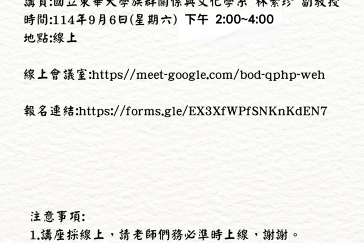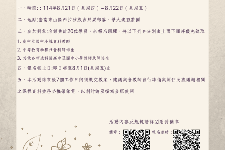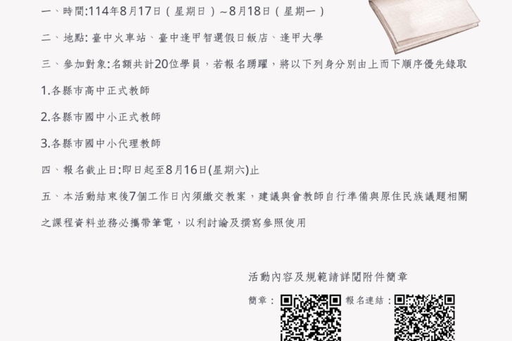 114年原住民族教育議題教學設計工作坊【原住民族升學保障制度教學設計工作坊-(台中場)】 2025-08-06 📣【教師專業成長 x 原住民族教育】 原住民族升學保障制度教學設計工作坊【台中場】熱烈招生中! 你是否想更深入&hell…