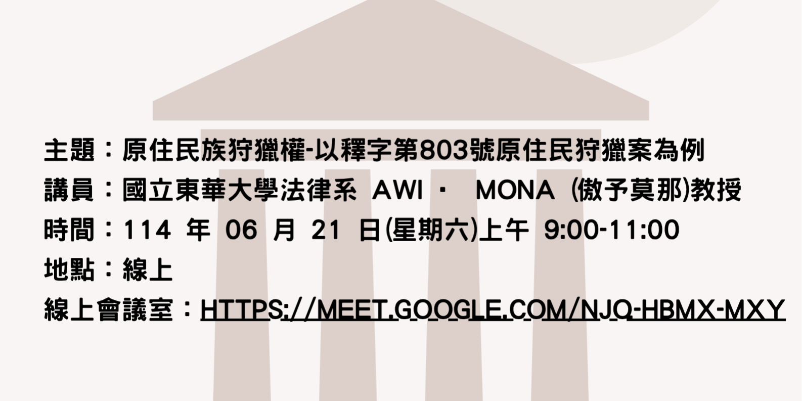 講員:國立東華大學法律系 Awi · Mona (傲予莫那)教授