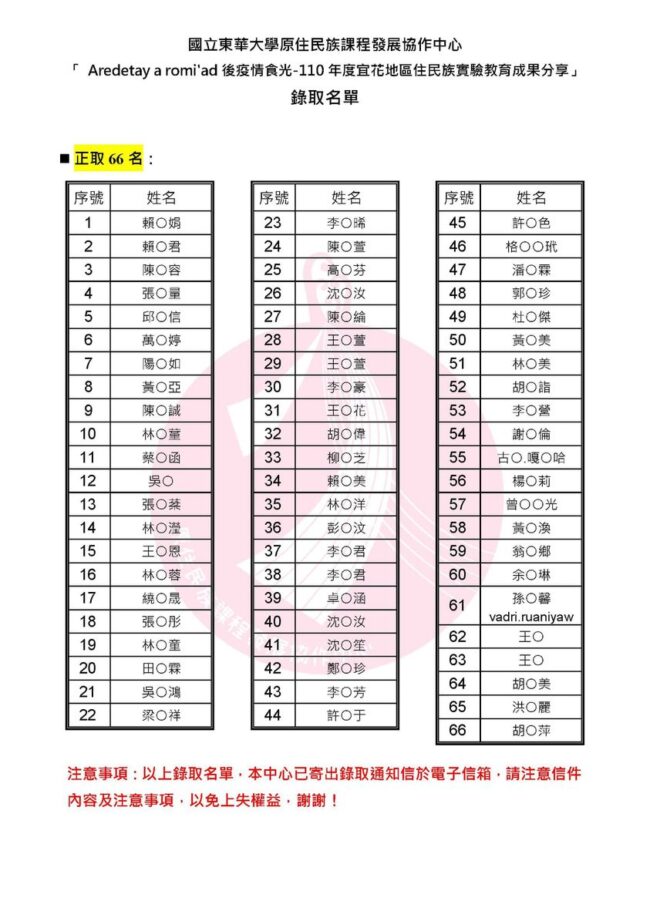 《Aredetay a romi’ad 後疫情食光- 110年度宜花地區原住民族實驗教育成果分享》錄取名單公佈 最新消息By peydang2021-12-07【錄取名單公告】 本中心《Aredetay a romi’ad 後疫情食光- 110年度宜花地區原…