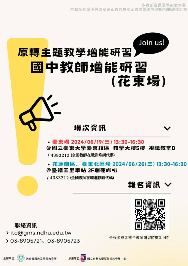 【活動報名】「原住民族歷史正義與轉型正義」主題教學增能研習- 國中教師增能研習(花東場) 最新消息By peydang2024-06-13隨著108課綱上路,教學過程中增添了許多從原住民族主體出發的教學內容,本場次研習將透過「原住民族歷史正義與轉型…