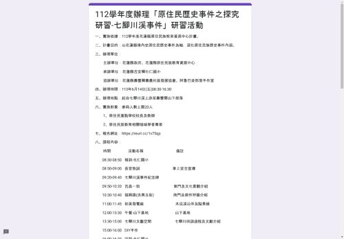 【活動報名】112學年度辦理「原住民歷史事件之探究研習-七腳川溪事件」研習活動 最新消息By peydang2024-06-13一、實施依據:112學年度花蓮縣原住民族教育資源中心計畫。 二、計畫目的:以花蓮縣境內史原住民歷史事件為軸,深…