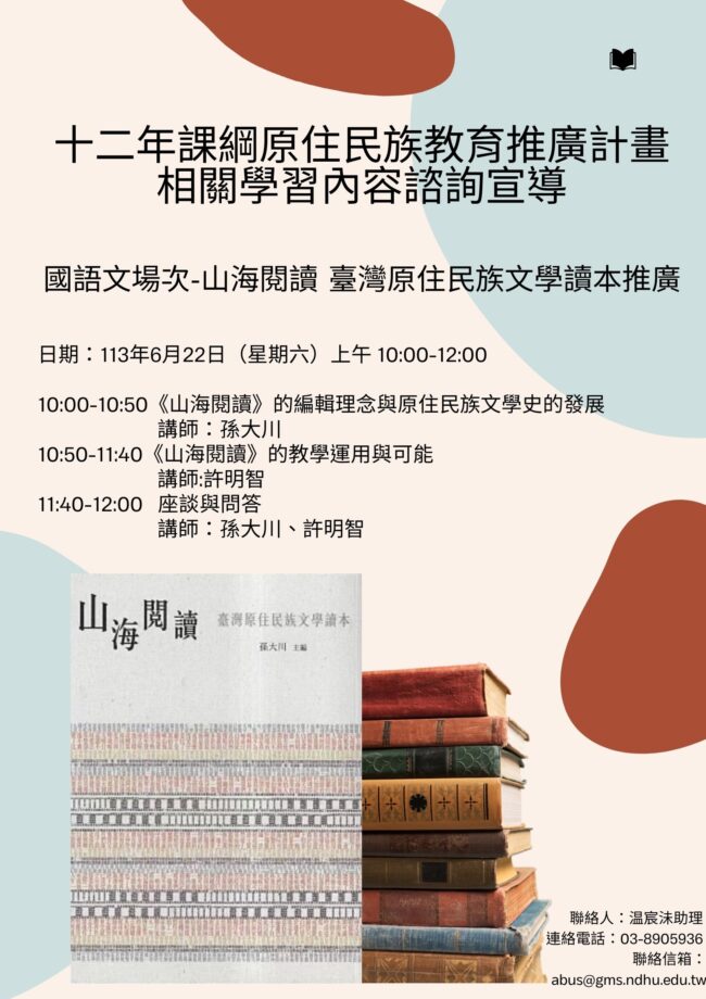 【十二年課綱原住民族教育推廣計畫】 原住民族相關學習內容諮詢宣導【國語文場】線上講座,開放報名囉! 分享園地, 最新消息By twelveyears2024-06-18即日起可以至全國教師在職進修網站上報名,相關資訊參考官網最新消息。 https://ieiw.k12ea.go…