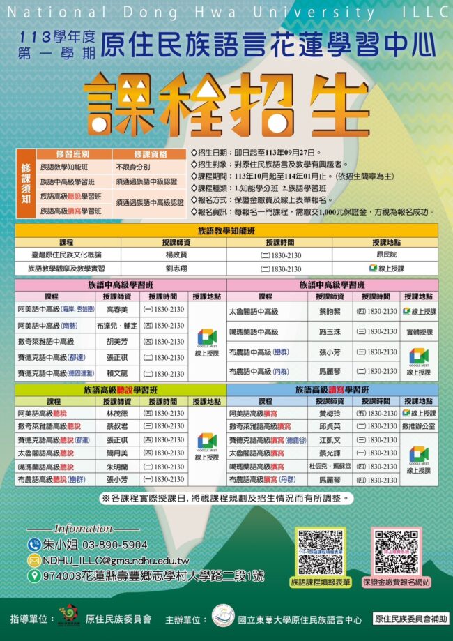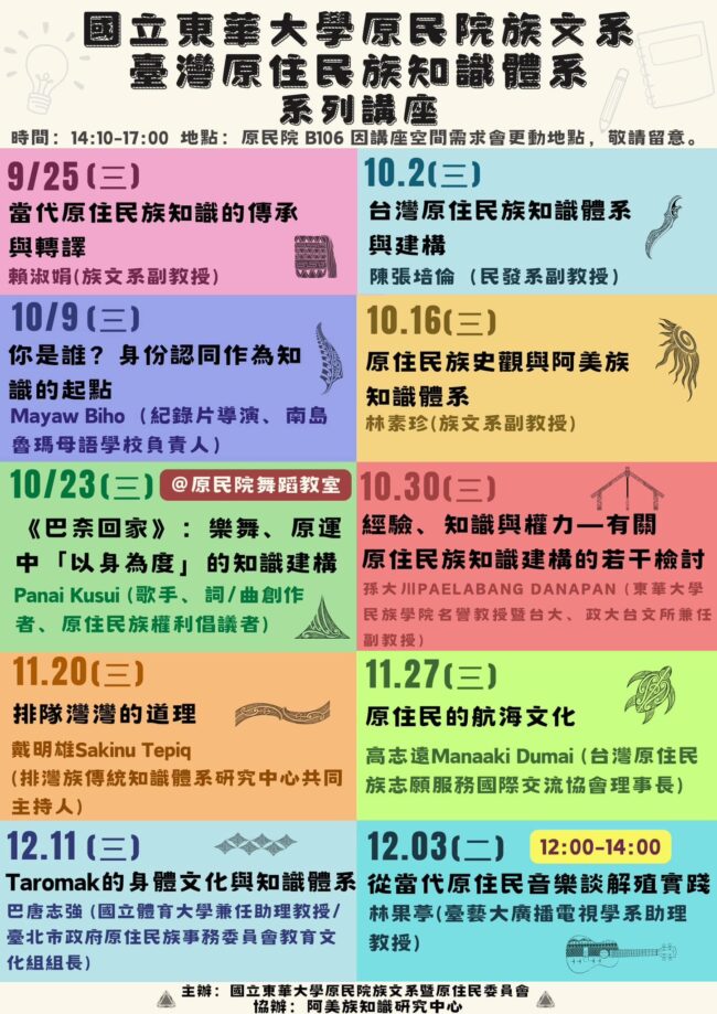 【活動報名】國立東華大學原民院族文系臺灣原住民族知識體系系列講座 最新消息By peydang2024-09-12國立東華大學原住民民族學院為臺灣原住民族研究重鎮,因而在原民相關課程的開設、講座的安排相當的多元、豐富,本文主…