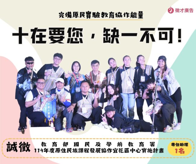 【徵才訊息】誠徵【114年度原住民族課程發展協作宜花區中心實施計畫之計畫專任助理】一名 最新消息By peydang2024-12-23【徵才公告】國立東華大學原住民族課程發展協作中心 誠徵【計畫專任助理】一名 職缺:教育部國民及學前教育署114…