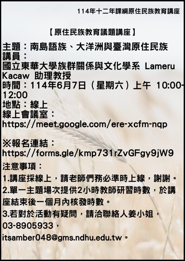 原住民族教育議題講座 【南島語族、大洋洲與臺灣原住民族】 最新消息By twelveyears2025-05-14【原住民族教育議題講座】 主題:南島語族、大洋洲與臺灣原住民族 講員:國立東華大學族群關係與文化…