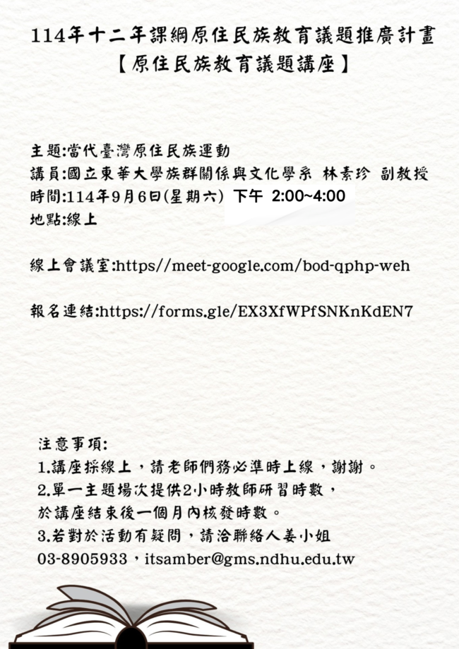 114年十二年課綱原住民族教育議題推廣計畫 【原住民族教育議題講座】 主題:當代臺…
