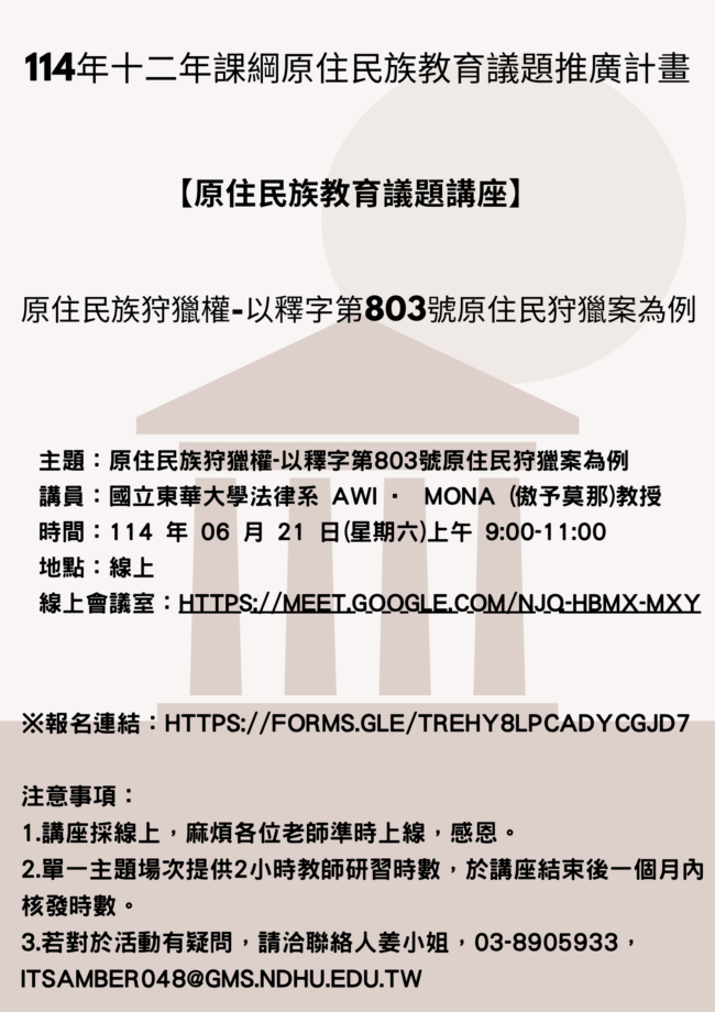【原住民族教育議題講座】 主題:原住民族狩獵權-以釋字第803號原住民狩獵案為例 講員:國立東華…