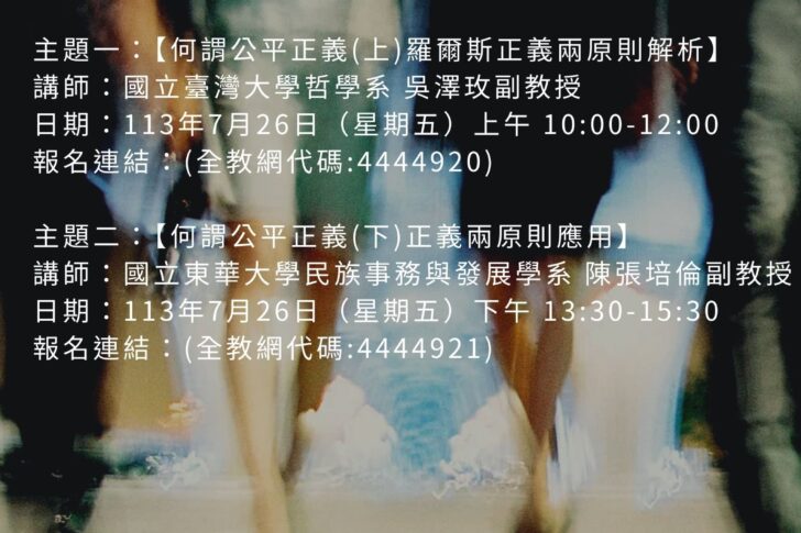 原住民族相關學習內容諮詢宣導【何謂公平正義】線上講座,開放報名囉! 2024-07-10 即日起可以至全國教師在職進修網站上報名,相關資訊參考官網最新消息。 https://ieiw.k12ea.go&hell…